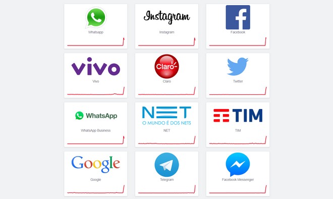 WhatsApp e Instagram fora do ar. Todos são de propriedade do Facebook. Segundo comentários de usuários no Twitter o WhatsApp não envia e não recebe mensagens e mostra apenas o símbolo de relógio indicando que o texto não chegou ao destinatário.